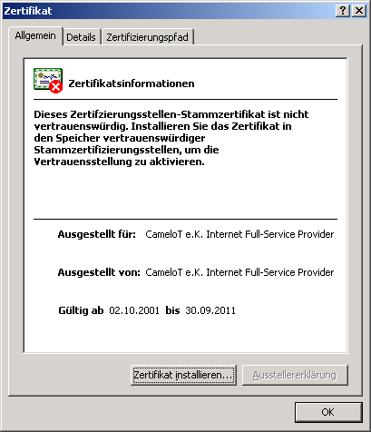 Sie haben jetzt das CameloT-Zertifikat als Stammzertifikat installiert.